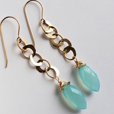Very lightweight blue chalcedony earrings with hand made hammered chain.