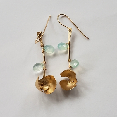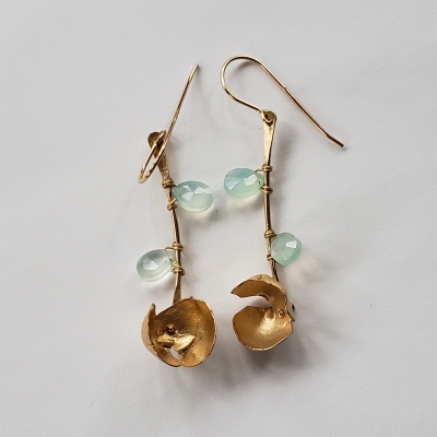 Long blue chalcedony earrings, hand forged 14k gold filled flowers complete the look.