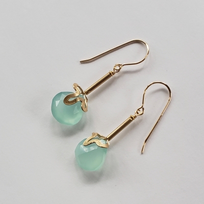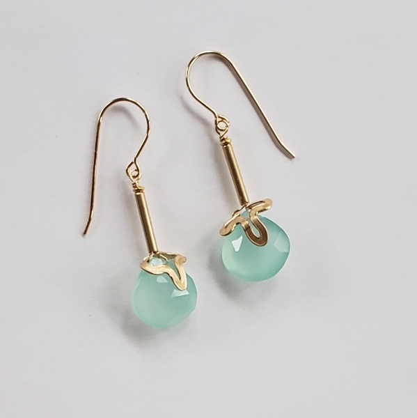 The hand forged 14k gold flowers crown these gorgeous blue chalcedony earrings.
