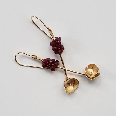 Shimmering garnet earrings, 14k gold filled flowers.