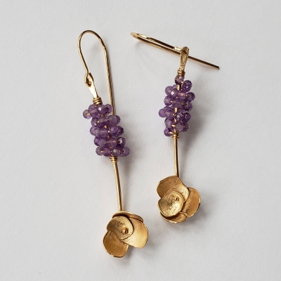 Lovely amethyst earrings, hand forged 14k gold filled flowers.