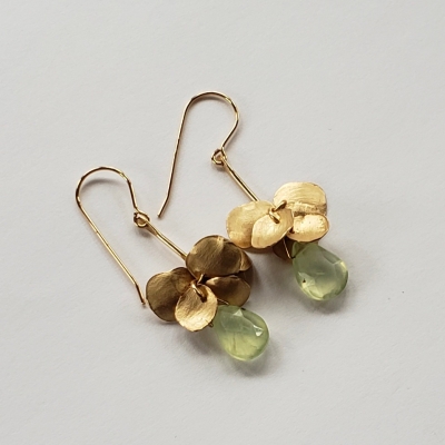 Peridot briolette swings from hand forged gold leaves. Hand made earrings.