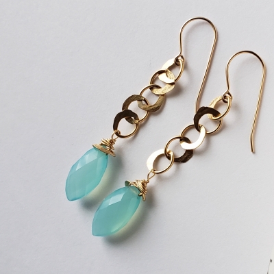 Very lightweight blue chalcedony earrings with hand made hammered chain.