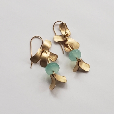 Hand forged gold petals drape over the blue chalcedony bead. Lightweight.