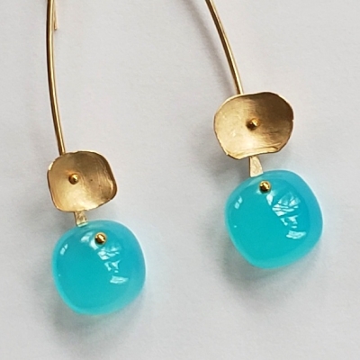 Incredible blue chalcedony candy like earrings with hand forged gold accents. Lightweight.