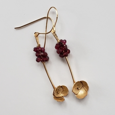 Shimmering garnet earrings, 14k gold filled flowers.