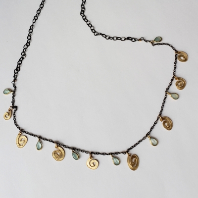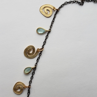 Chocker style necklace, great for layering, blue chalcedony teardrops,14k g.f. hand forged spirals.