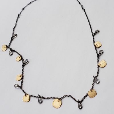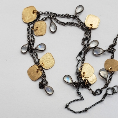 Chocker style necklace, great for layering, moonstone teardrops,14k g.f. hand forged petals.